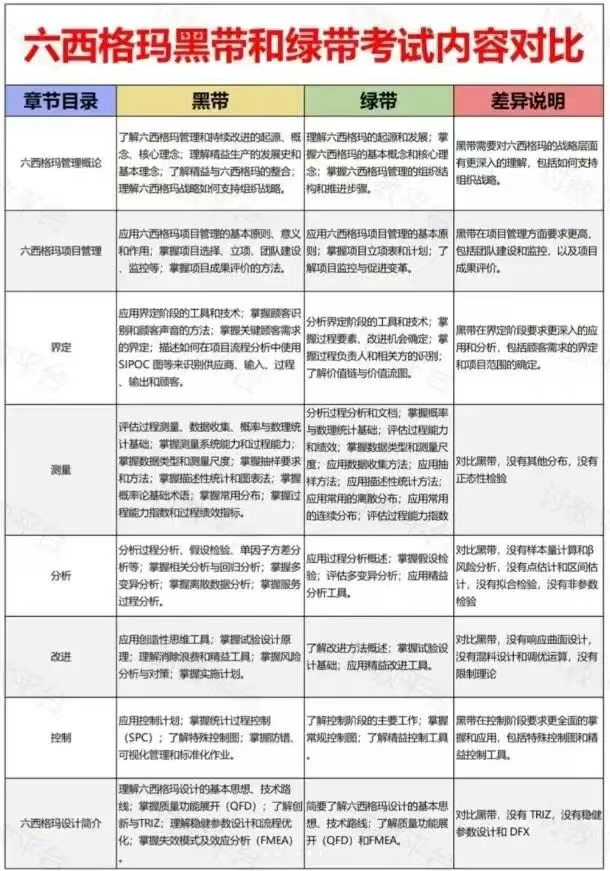 绿带:主要涵盖六西格玛的基本概念、方法和工具,如 DMAIC 改进流程、基础统计工具等,内容较为基础,侧重于对六西格玛理念的理解和简单工具的应用。